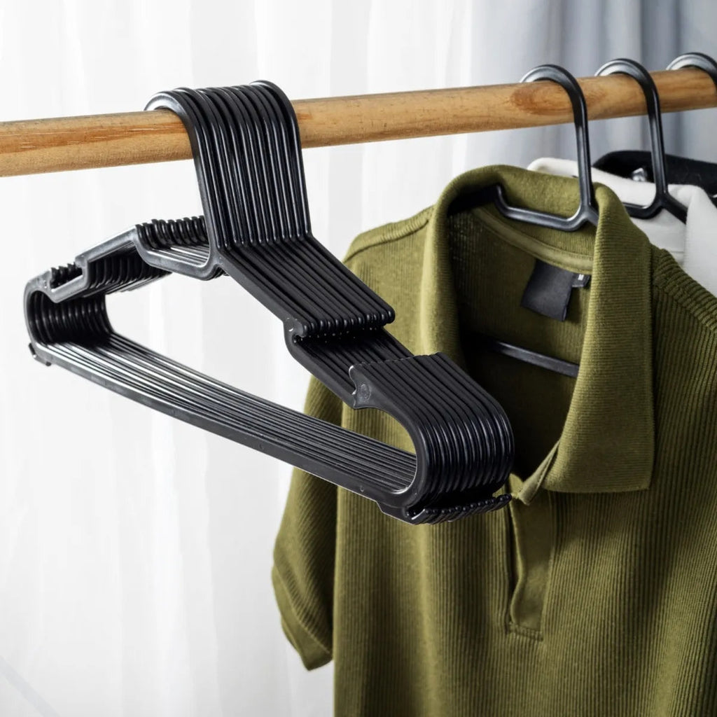 Fabricados em plástico resistente, os cabides suportam desde roupas leves, como camisetas e lingerie, até peças mais pesadas, como jaquetas e ternos, sem deformar.